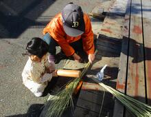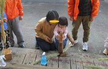 キッズパークの田んぼで収穫したわらを使ってしめ縄作りを行いました。わらをたたいて編むところから始めました!