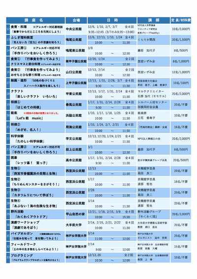| 13 | ふしぎ理科教室 | 鳴尾公民館 | 20人 | 必要 | 12月6日(土曜),12月13日(土曜), 1月10日(土曜),1月24日(水曜) 全4回 10時00分~11時30分 |