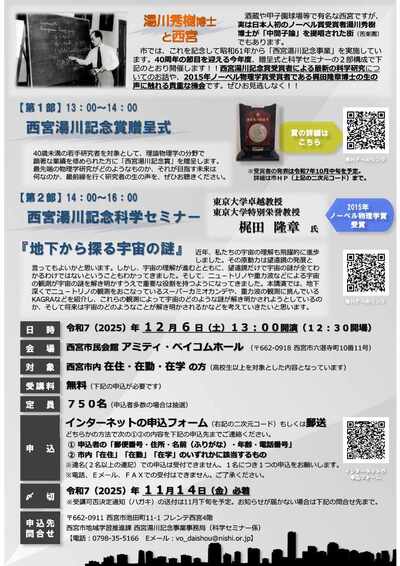 今年度は西宮市制100周年 西宮湯川記念事業40周年を記念して、下記のとおり実施いたします。