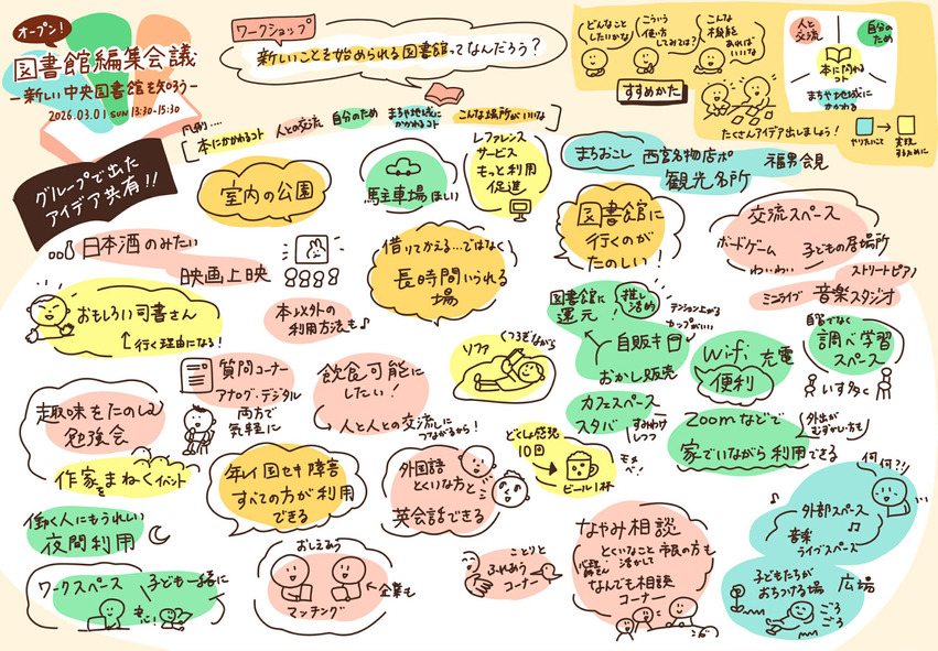 新しい中央図書館でやってみたいこと、ほしい機能やイベントなどについて考えるワークショップ「図書館編集会議」を開催します。