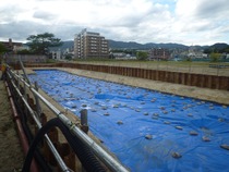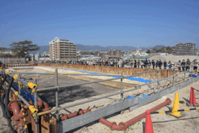 本発掘調査は長期におよぶため2期に分けて行う予定です。本発掘調査(1期)が令和7年8月から開始しました。土留め等の仮設物を設置し、これから本格的な調査が実施されます。