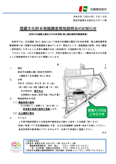 西宮中央運動公園再整備事業に伴う埋蔵文化財本発掘調査の調査成果について、現地説明会を開催いたします。