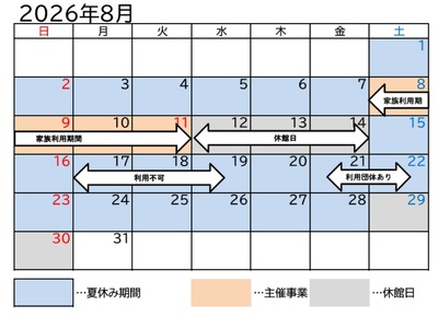 - 8月8日~10日泊の家族利用期間は、5月7日以降に山東自然の家へ個別申込となります。