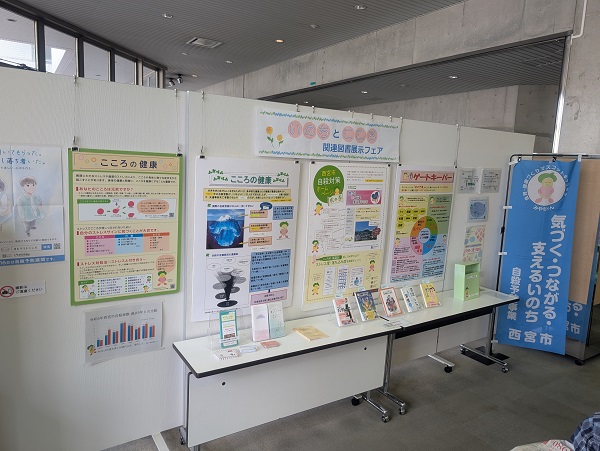 中央図書館にて、いのちとこころ関連図書展示フェアを開催しました。西宮市の自殺の現状、こころの健康、ストレス対処などの啓発を行い、こころに関する書籍などの展示も併せて実施しました。