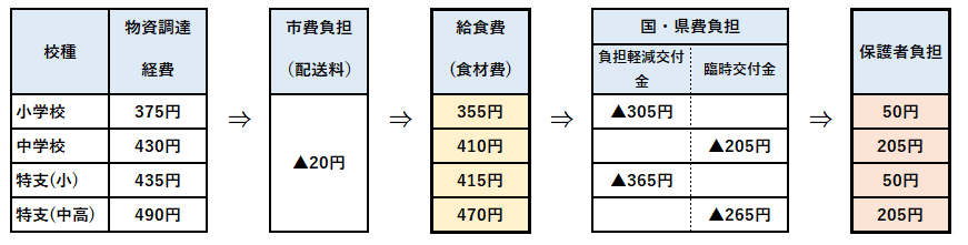 これまで学校給食費の一部として保護者負担としていた食材の配送委託料(1食あたり約20円)を市が負担することとし、保護者は食材費のみを負担することとしました。