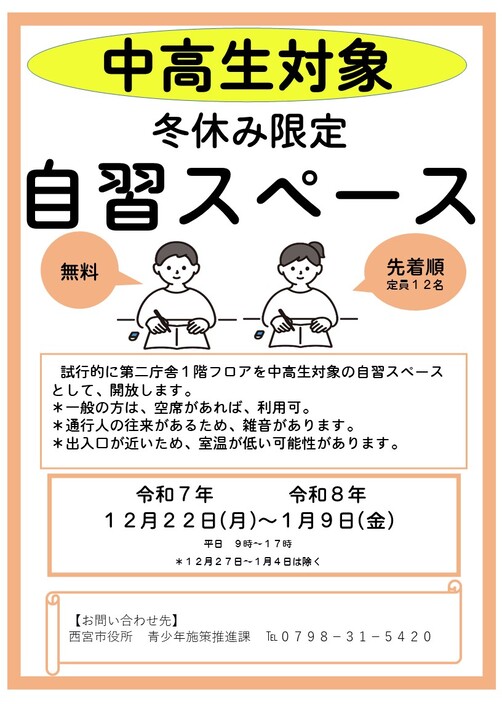市内では、公民館等の一部施設に冬休み限定自習室を開設します。