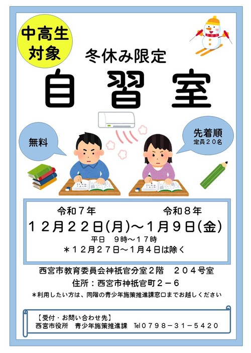 各施設により、開設日時等が異なるため、詳細はこちら【中高生限定】冬休み期間 市内各所で自習室を開設します新規ウインドウで開きます。をご参照ください。
