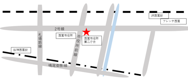 阪神西宮駅市役所出口を北に出、徒歩2分
