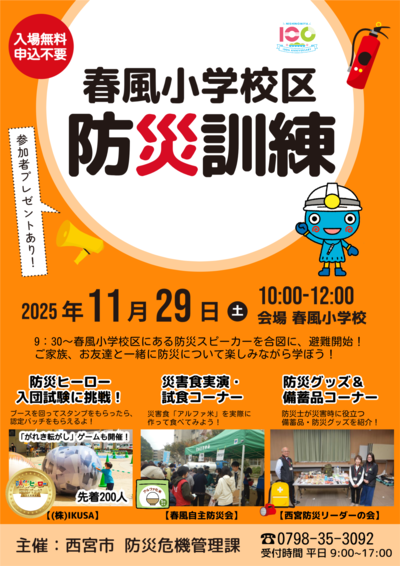西宮市では、平成27年度(2015年度)より小学校区単位での防災訓練を行っています。
