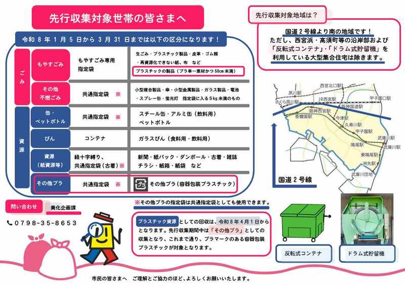 先行収集地域で、西宮浜・高須町等の沿岸部および反転式コンテナ・ドラム式貯留機を利用している大型集合住宅は令和8年4月から開始です。先行収集地域で反転式コンテナ・ドラム式貯留機を利用していない集合住宅は、令和8年1月から収集を行います。